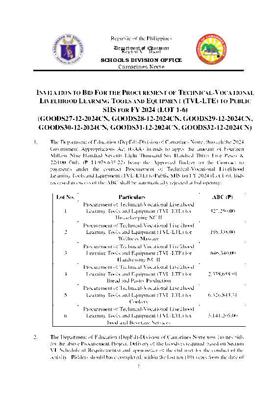 PROCUREMENT OF TECHNICAL-VOCATIONAL LIVELIHOOD LEARNING TOOLS AND EQUIPMENT (TVL-LTE) TO PUBLIC SHS FOR FY 2024 (LOT 1-6)